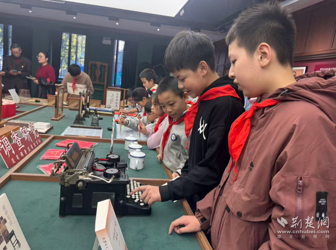体验区里,红色氛围愈发鲜活:少先队员们拿起毛笔,在仿旧宣纸上临摹《沁园春·雪》等红色诗词,一笔一划间感受文字里的磅礴情怀;拓印台前,大家认真操作工具复刻革命老照片,当黑白影像逐渐清晰,仿佛与先辈岁月完成跨时空对话;老式电报机旁,少年们好奇地按下按键,在“滴滴答答”的模拟声中,体会革命年代通讯的艰辛与信仰的坚定。