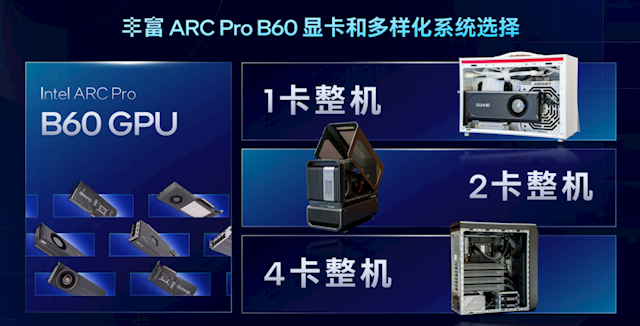 另外,针对有着更高需求的专业用户、中小企业、工作室,Intel最近还推出了锐炫Pro B60专业显卡,搭配酷睿Ultra或者至强W处理器,可组成更强大的工作站,支持单卡、双卡、四卡、八卡甚至是多块双芯卡的不同组合,还可以搭配Gaudi AI加速器。