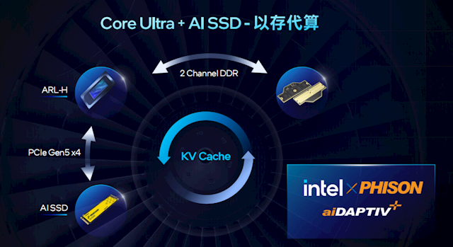 Intel与群联电子共同将aiDAPTIV+技术与酷睿Ultra 200H系列处理器结合,通过PCIe 5.0 AI SSD实现“以存代算”,显著加速模型推理。